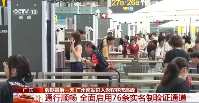 钱干明总部:10月6日起,广州南站进入假期返程客流高峰期。今天,不少旅客提着大大小小的行李来到候机大厅。为让旅客安检更加便捷,广州南站在客流高峰期间全面开通76条实名认证通道和48条安检通道。虽然安检口p flowAssenger很多,但总体交通还是比较顺畅的。大约需要10分钟es平均进入候车大厅。
